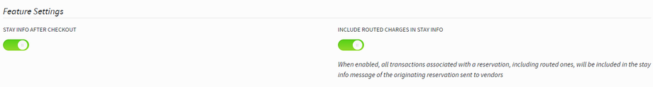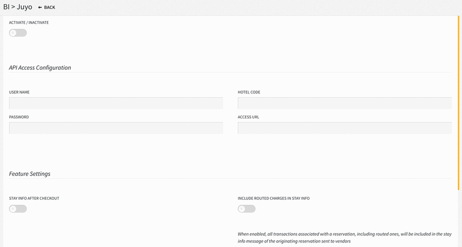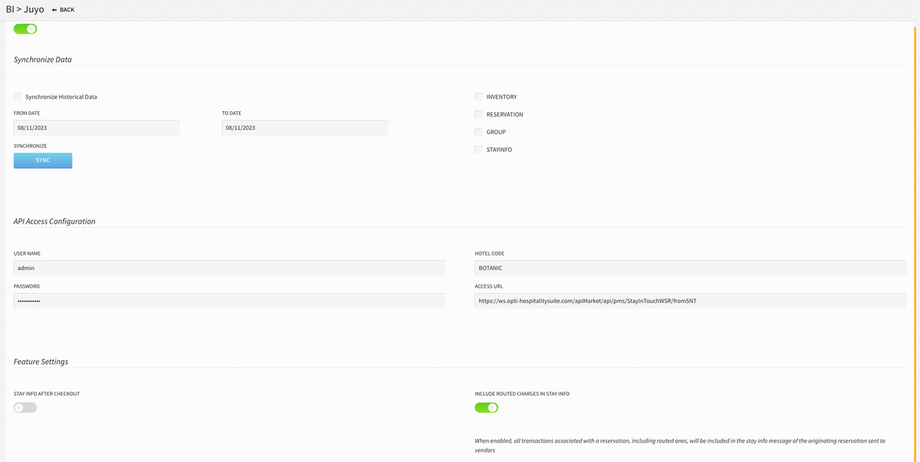 - STAY INFO AFTER CHECKOUT: Enabling this will send an update to Juyo with the final revenue for items; ROOM and F&B are based on charge code setup.