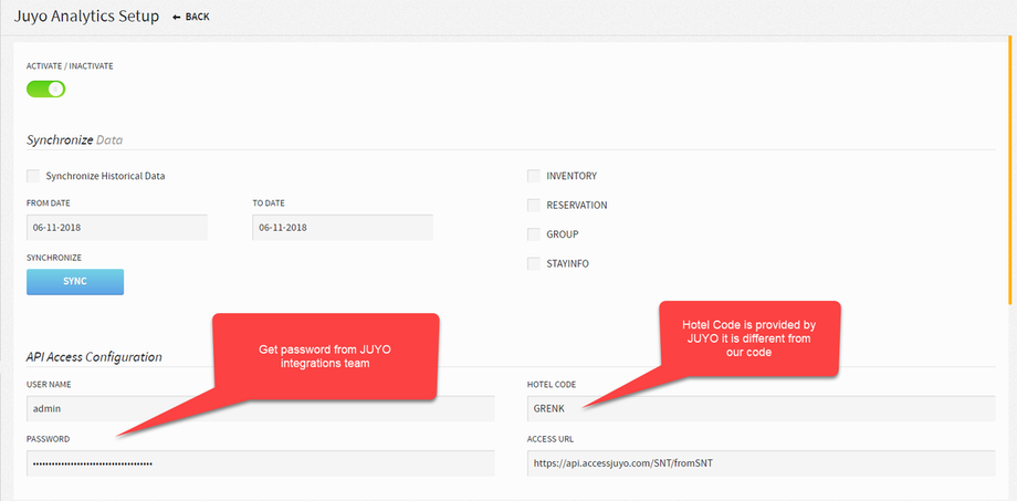 After configured is completed, data can be synced to Juyo for past guests as well as future guests by using the SYNC option.