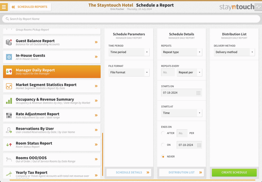 2. Schedule The Manager Daily Report: You can now schedule the Manager Daily Report from Reports > Schedule a Report/Export > Scheduled Reports > + NEW REPORT SCHEDULE.