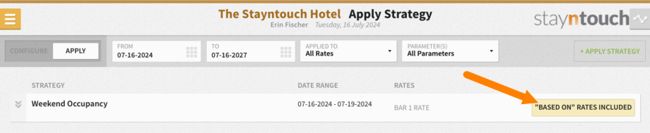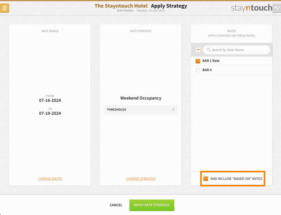 3. Rate Strategy: Apply Restrictions To “Based On” Rates: When the Rate Strategy functionality is enabled for a property, from Revenue Management > Rate Strategy, you will now see the option to AND INCLUDE "BASED ON" RATES when selecting rates. When this option is selected and saved, it will be displayed on other Rate Strategy screens.