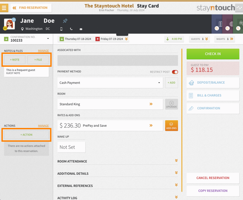5. Add Note, File, & Action Buttons: We’ve added + NOTE, +FILE (if file attachments are enabled for your property), and +ACTION buttons to the stay card, so you can easily add notes, files, or actions without having to open the respective popup windows first.