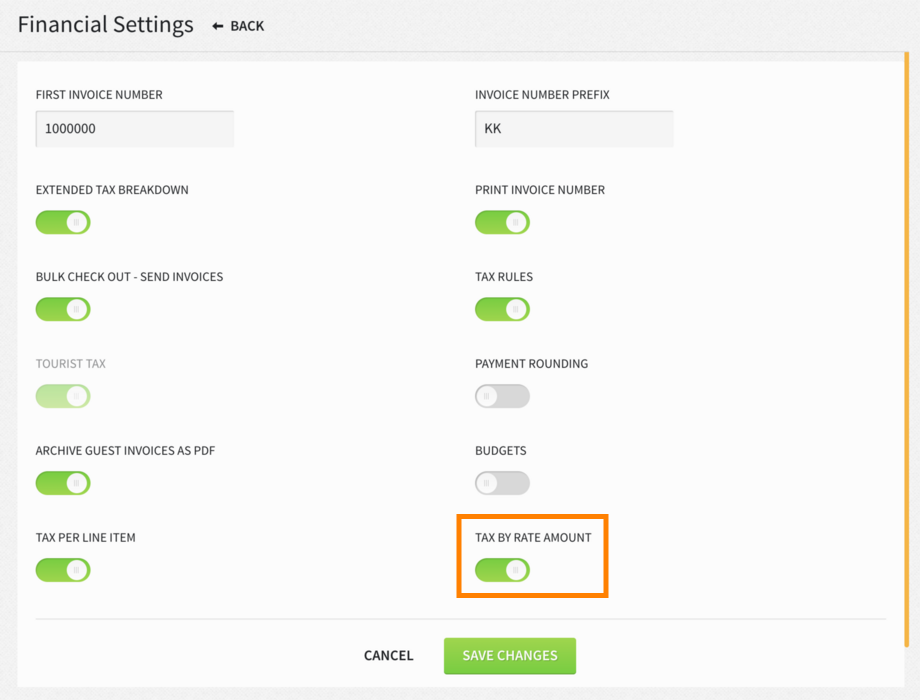 We’ve added a new tax rule, in which the tax calculation is based on the rate amount of the reservation. You can enable this TAX BY RATE AMOUNT from Settings > Financials > Financial Settings. Tax rules must be enabled to activate tax by rate amount.