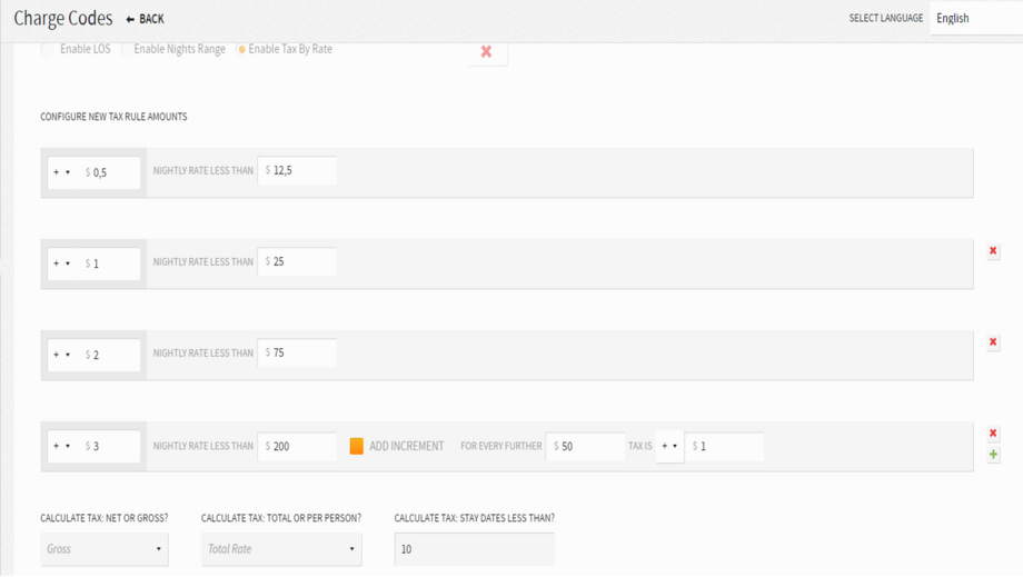 Additional calculation rules can be configured to calculate the tax based on the gross or net amount of the rate. You can also configure rules to calculate the tax on the total rate amount or the total rate amount divided by the number of people in the room (depending on the amount type selected).