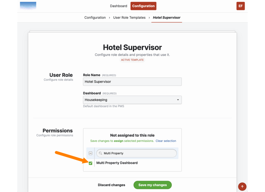 Hotels using the Multi-Property functionality can choose to assign the Multi-Property dashboard view to additional user roles. To enable this functionality, please contact Customer Support. Once enabled, when you log into a Multi-Property account, a new permission will be available from Configuration > Roles & Permissions called Multi-Property Dashboard. When a user logs in with a user role that has the Multi-Property Dashboard permission assigned, they will be directed to the Multi-Property dashboard.