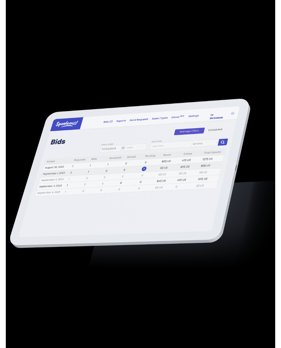 Sponteous allows hotels to send personalized invites to their guests via email, SMS, or WhatsApp a few days before their arrival, inviting them to bid on one of the available premium rooms or enhance their stay with other products. With a simple slider, guests can name their price for an upgrade, and the hotel has the option to accept or reject the offers. The entire process can be fully automated, taking into account the availability of the rooms.