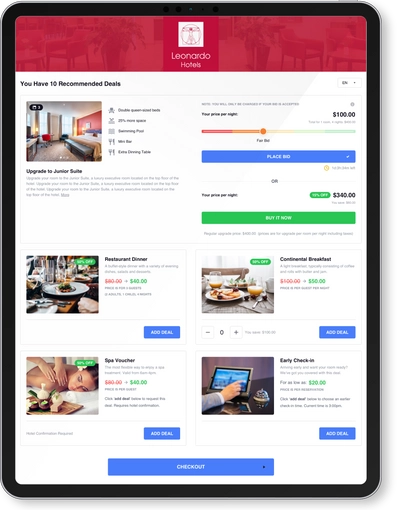 - Premium Upgrade: Provide hotel guests with the option to bid on or purchase premium room upgrades through a seamless, white-label user experience.