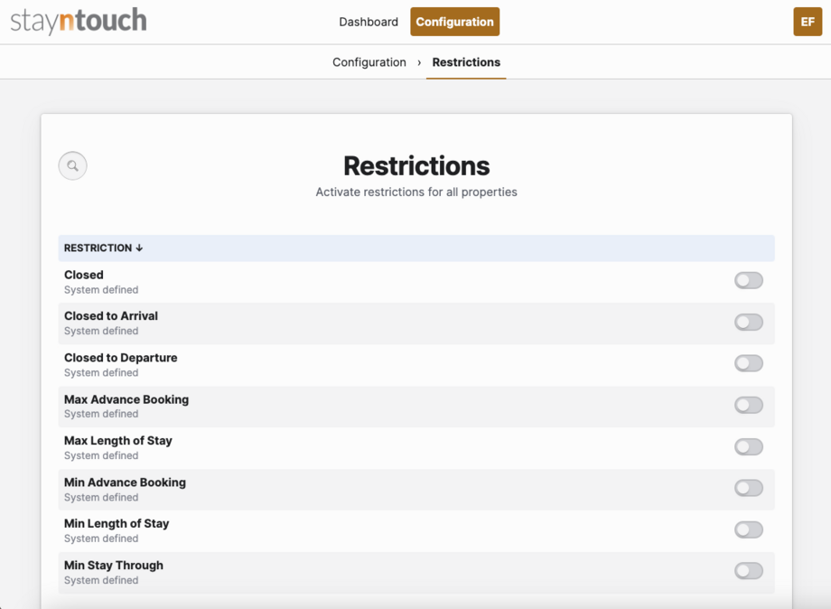 You can enable Multi-Property restrictions from Configuration > Rates > Restrictions by toggling on the necessary restrictions. Please note, restrictions are system-defined. Learn more here.