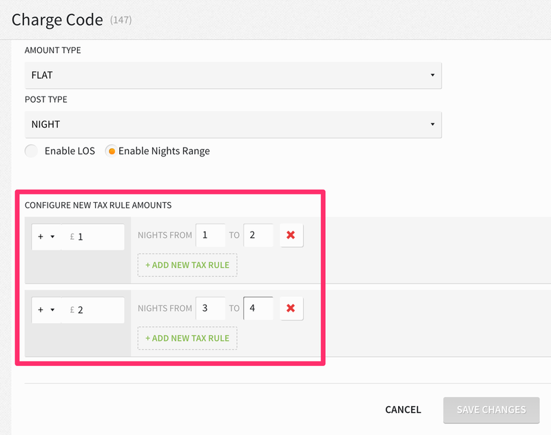 We have a Nights Range custom tax rule for properties that have the TAX RULES toggle turned ON from Settings > Financials > Financial Settings. To configure a Nights Range custom tax rule, navigate to Settings > Financials > Charge Codes. When you create a new charge code or edit an existing one, you can now select an Enable Nights Range checkbox, which will allow you to select Nights Range in the CONFIGURE NEW TAX RULE AMOUNTS section.