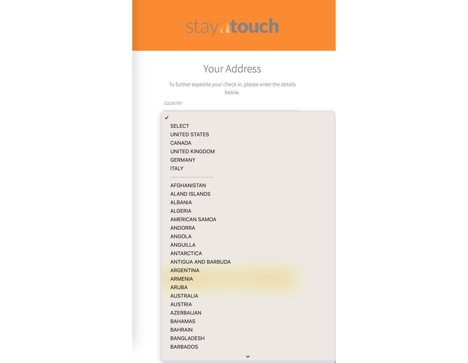 When a user selects the country dropdown via Stayntouch PMS, Stayntouch Guest Mobility, and Stayntouch Guest Kiosk, the defined countries will appear, in order, above the dashed line.