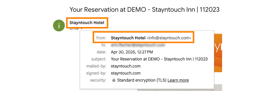 That will then display just "Stayntouch Hotel" from the inbox "From" address instead of "info@stayntouch.com".