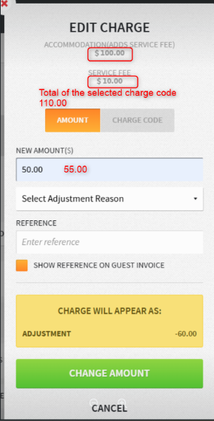 Important Note: When adjusting a parent charge with a service fee, you must consider the service fee in your calculations. For example, a room charge of $100 that also has a service fee of $10 for a total of $110. To adjust half the amount, you need to edit the parent room charge to $55 (not $50) for both room charge and service fee to adjust properly.