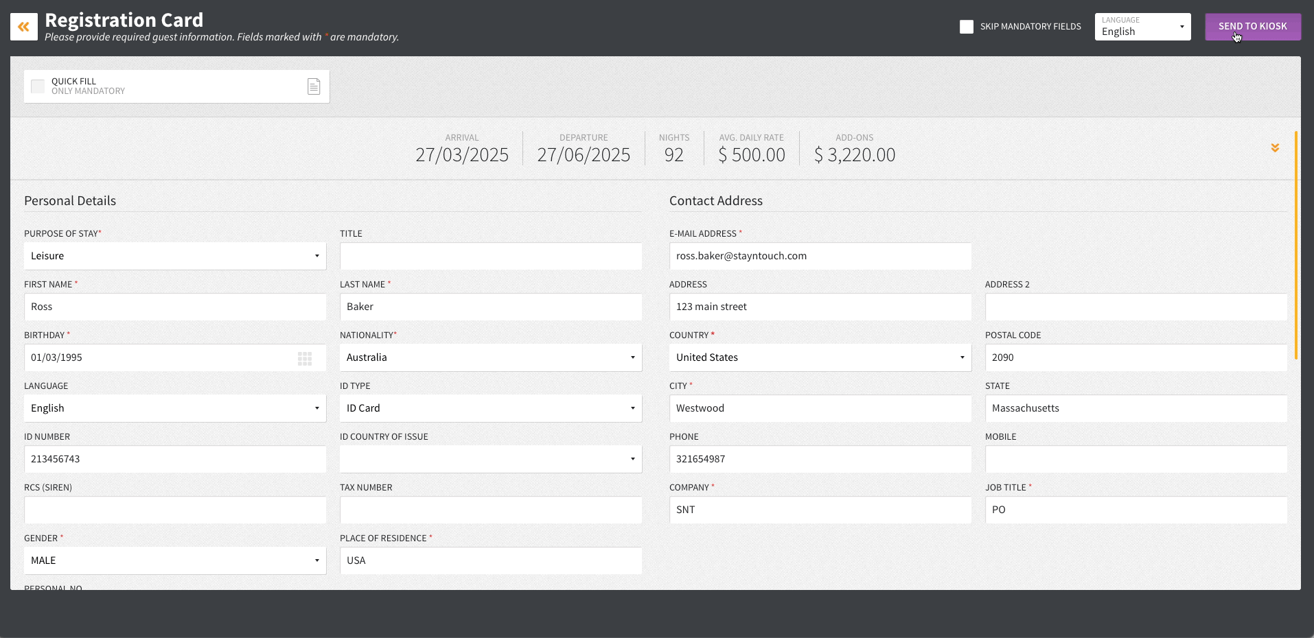 - Any updates made in the kiosk are automatically saved to the PMS registration card and the guest card.