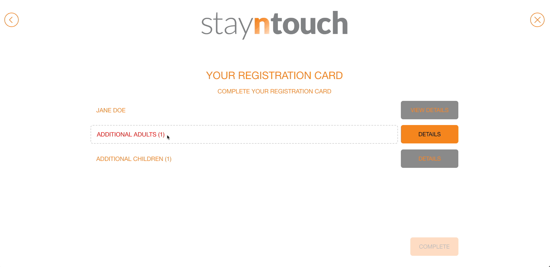 - Once all mandatory fields (for main and additional guests) are filled, the COMPLETE REGISTRATION button finalizes the process.