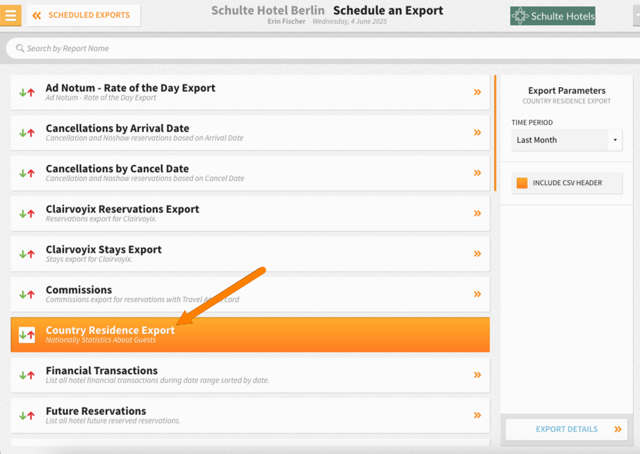 To streamline operations for properties in Germany and Austria, the Austrian Residence Country Export has been renamed and standardized to support both countries, as they share the same data format. The Austrian Residence Country Export is now renamed to Country Residence Export via Reports > Schedule a Report/Export > Scheduled Exports > + NEW EXPORT SCHEDULE. The export file itself is also renamed to Country Residence Export. This allows German properties to use the same export format previously available only to Austrian hotels.