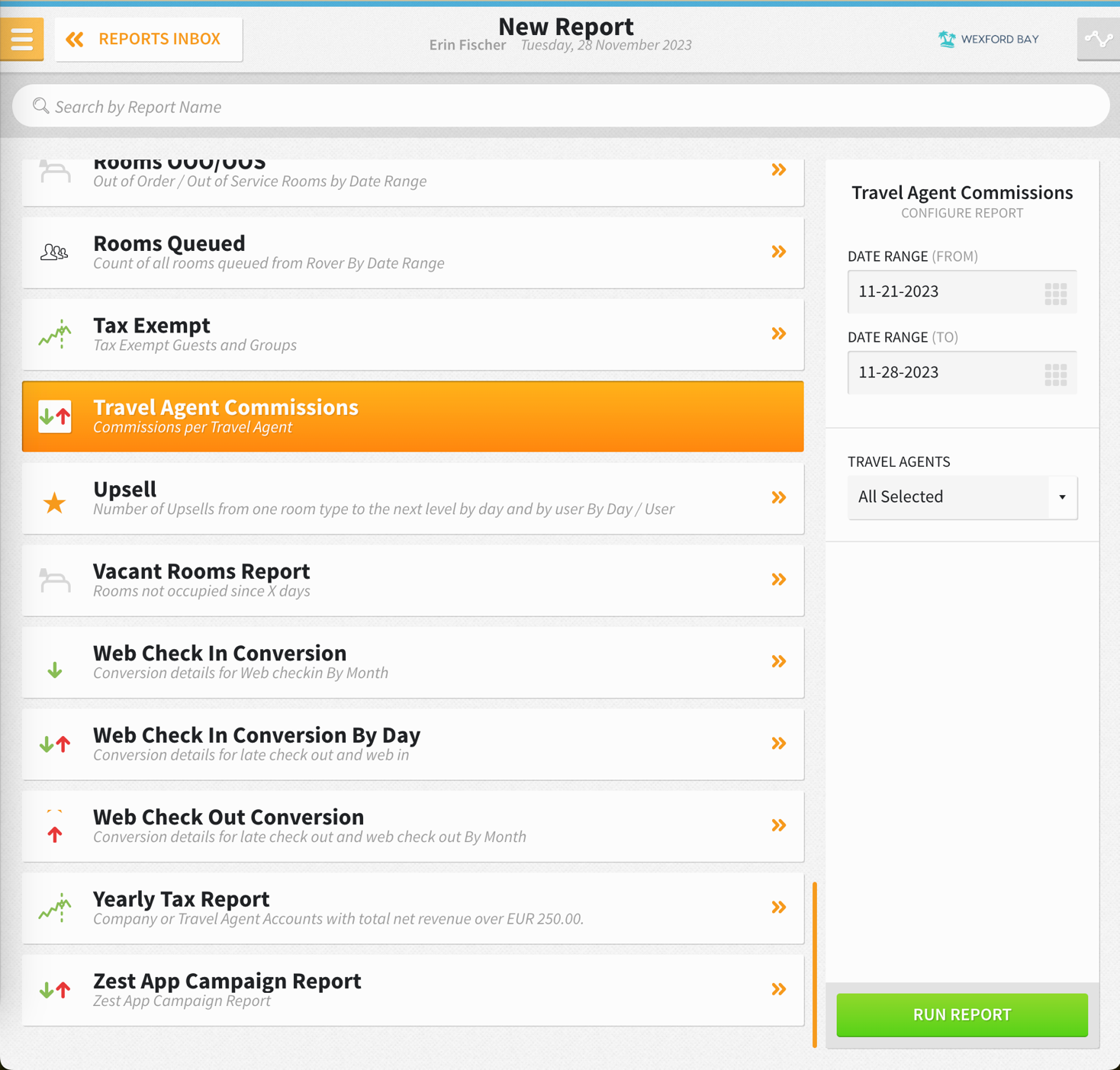 The Travel Agent Commissions Report can be printed, and it will appear in the Reports Inbox as pictured in the section below. You will see the following fields on the report: