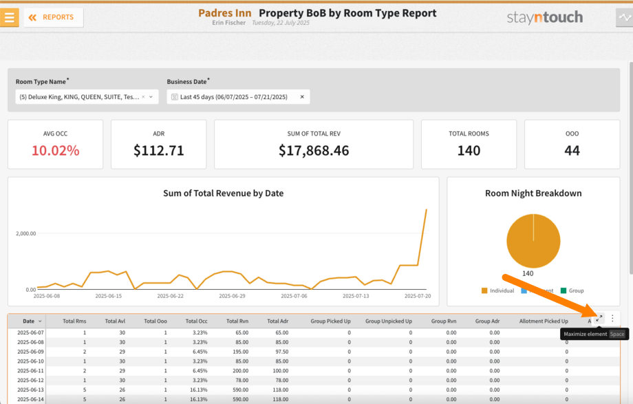 Once you’ve run the report, you can filter by Room Type Name and Business Date. The Business Date will default to the next 7 days, but you can sort by various date ranges.