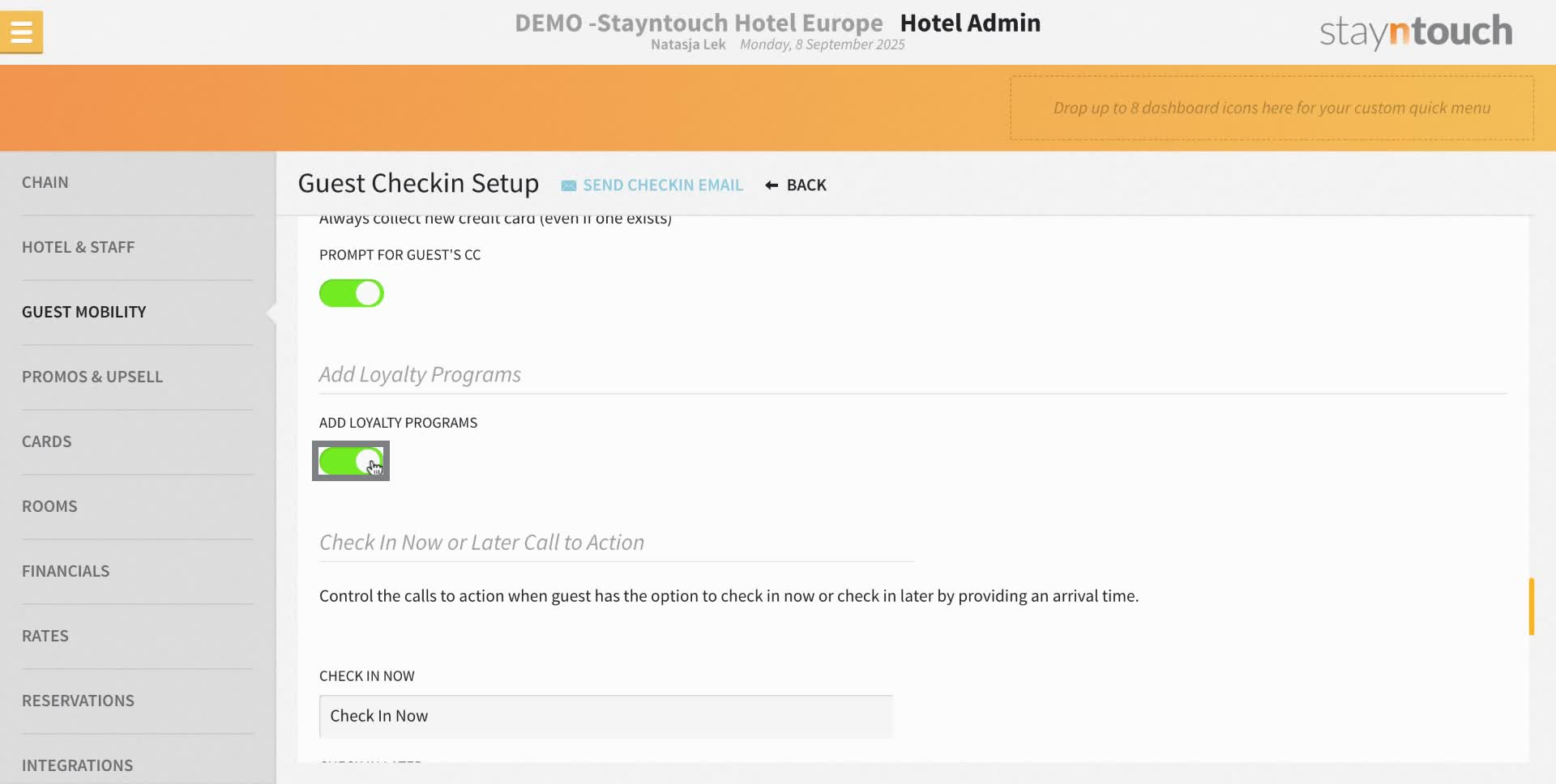 If your property works with loyalty programs, this information can also be requested during mobile check-in by enabling ADD LOYALTY PROGRAMS.