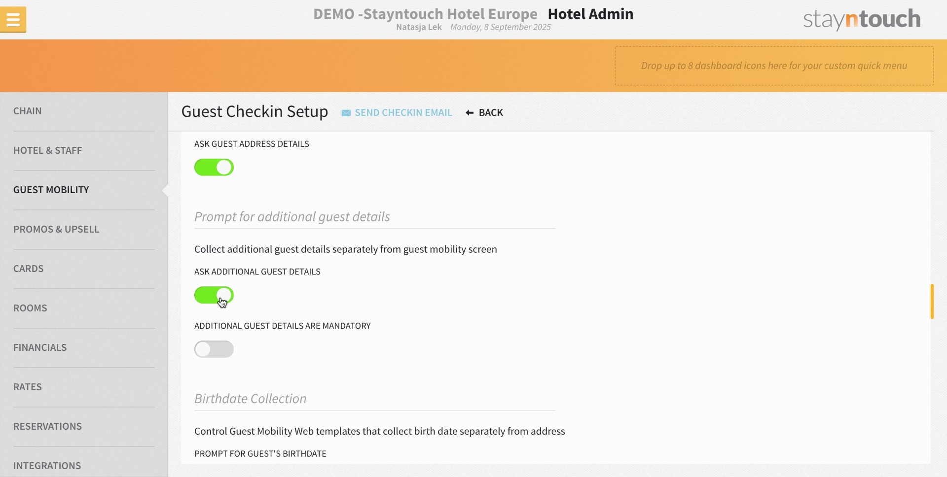 Toggle on PROMPT FOR GUEST'S BIRTHDATE if you want to collect these details. This information can be marked as mandatory, as well.