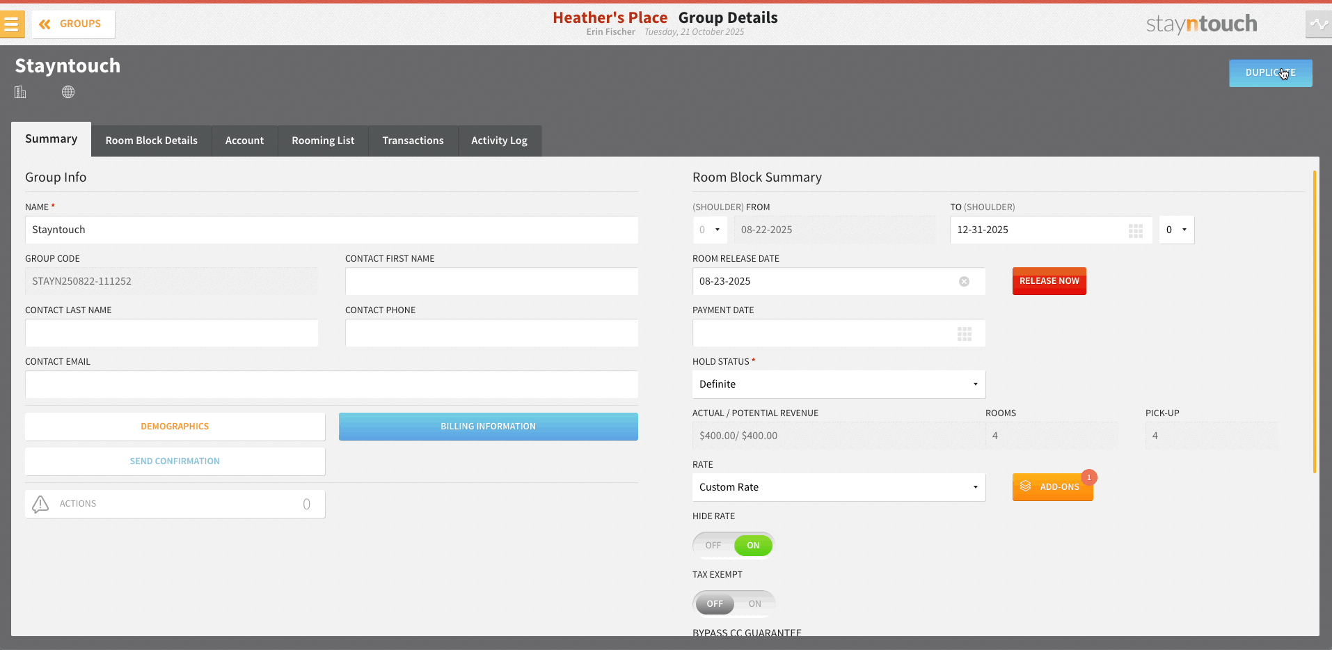 You can now copy an existing group’s (Groups > Manage Groups) details to quickly create a new one—perfect for repeat or returning guests! Simply click the new DUPLICATE button to open a pre-filled group creation screen with key details carried over. All fields remain fully editable, making group setup faster, smarter, and more flexible. Read more here.