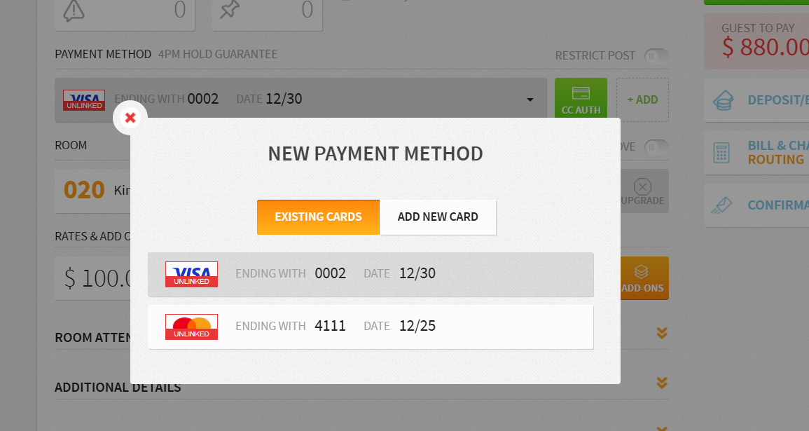 When adding an offline credit card, tokenized card, or debit card to a reservation’s stay card, some cards may not support recurring or future transactions. To make this clear for PMS users, any card that cannot be used for new or recurring payments will be marked as UNLINKED.