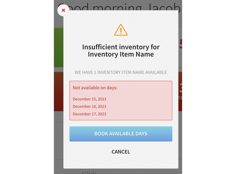 A new popup now highlights which stay dates an item is not available. All available days auto-select, and associates can adjust selections as needed. Users with overbooking permissions can choose to override; others can continue with available days only. Read more here.