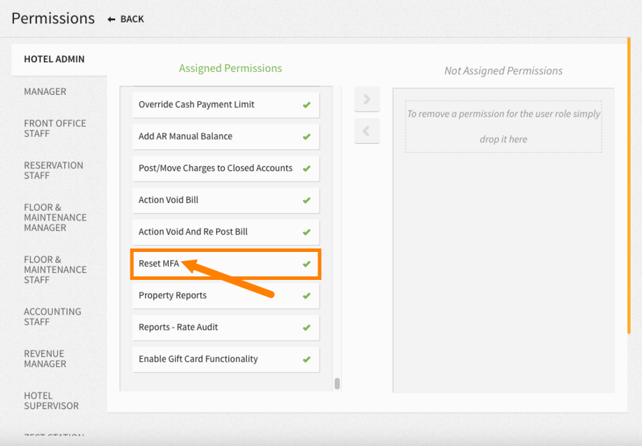 1. Assign MFA Reset Permission: Ensure your user account has the Reset MFA permission enabled from Settings > Hotel & Staff > Permissions.