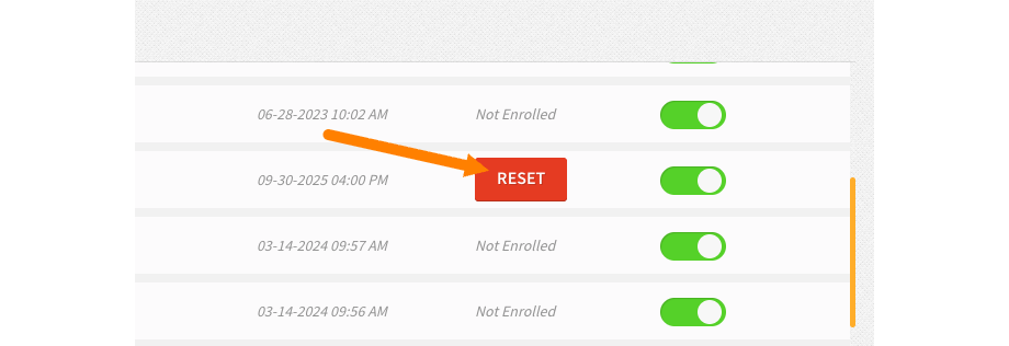 Click RESET next to the user’s two-factor settings.