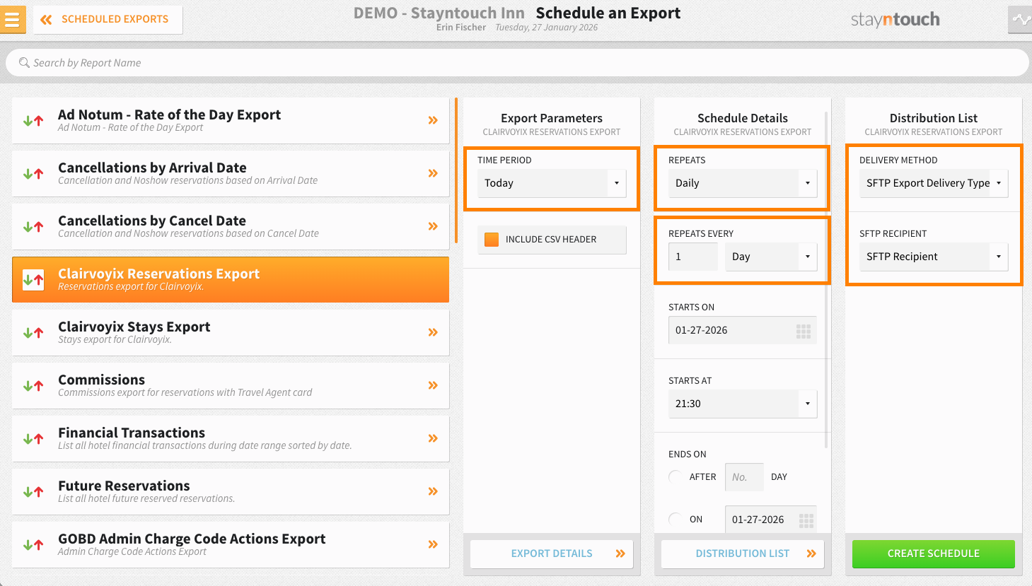 To configure For-Sight interface exports, first navigate to Reports > Schedule a Report/Export > Scheduled Exports > + NEW EXPORT SCHEDULE > Select Clairvoyix Reservations Export. Once you have selected the export, make sure the following parameters are configured as indicated in the text below. The parameters not indicated in the text below can be set as desired.