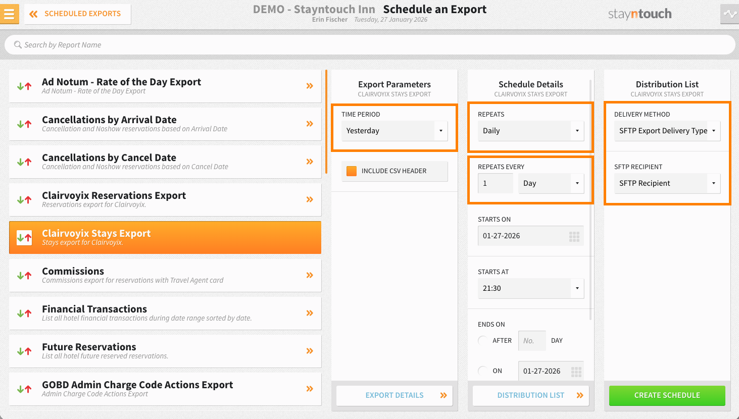 In addition to the Clairvoyix Reservations Export, you will also need to schedule the Clairvoyix Stays Export from Reports > Schedule a Report/Export > Scheduled Exports > + NEW EXPORT SCHEDULE > Clairvoyix Stays Export. Once you have selected the export, make sure the following parameters are configured as indicated in the text below. The parameters not indicated in the text below can be set as desired.