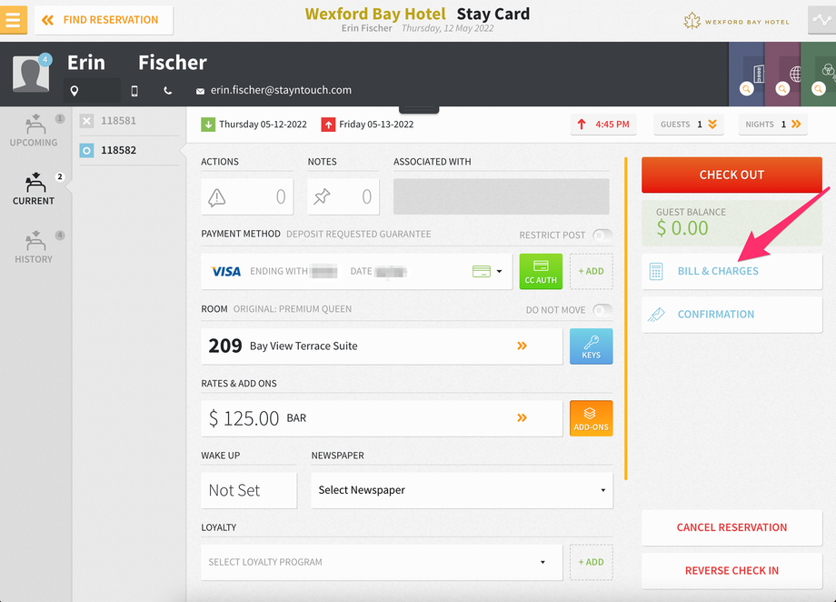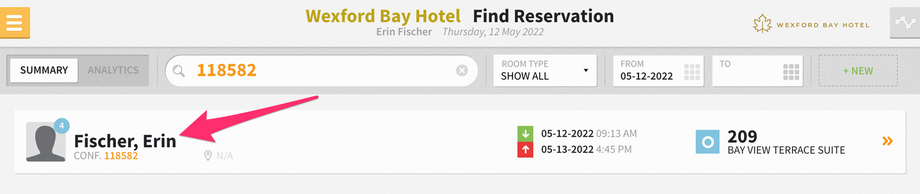 Enter the guest's name or confirmation number in the search bar and change the calendar FROM date to the appropriate past date. Then select the guest file to open the stay card.