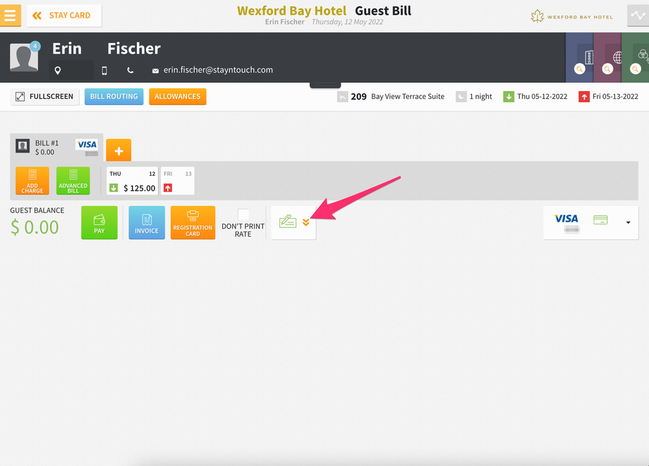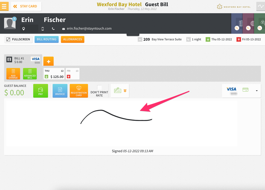 On the Guest Bill page, expand the signature icon to retrieve and view the signature with the date and time.