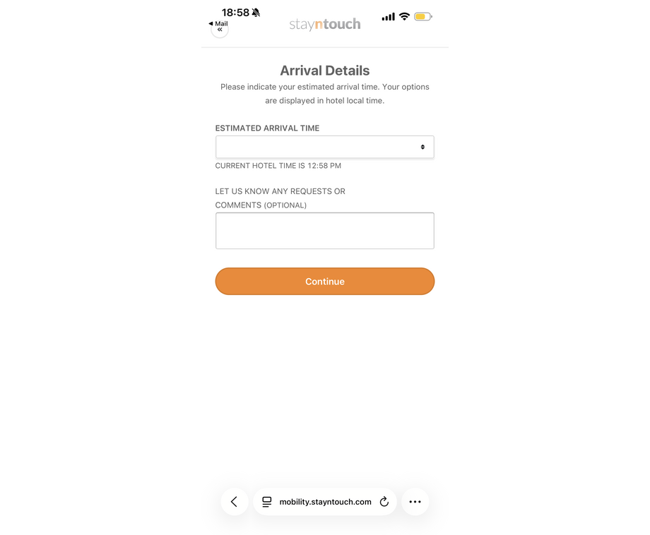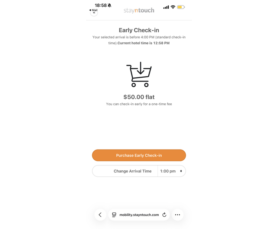 During both Stayntouch Guest Mobility check-in and Stayntouch Guest Kiosk check-in, when the EARLY CHECK-IN UPSELL toggle is enabled from Settings > Promos & Upsell > Upsell Early Check-In, if a guest enters an ESTIMATED ARRIVAL TIME before the hotel's standard check-in time, the guest will be offered an opportunity to purchase early check-in or change their arrival time to a later time.