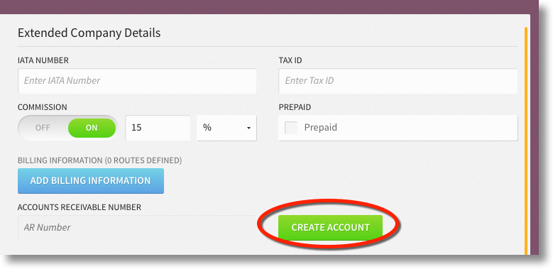 - You will want to select the CREATE ACCOUNT button to assign an A/R NUMBER to the Travel Agent Card.