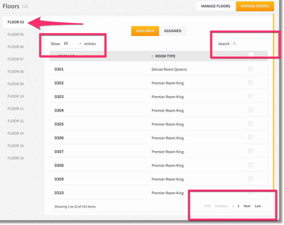 Once all floor numbers have been added, select MANAGE ROOMS to assign rooms to the selected floor. Select the floor number on the left side and AVAILABLE to view rooms that have yet to be assigned to a floor.